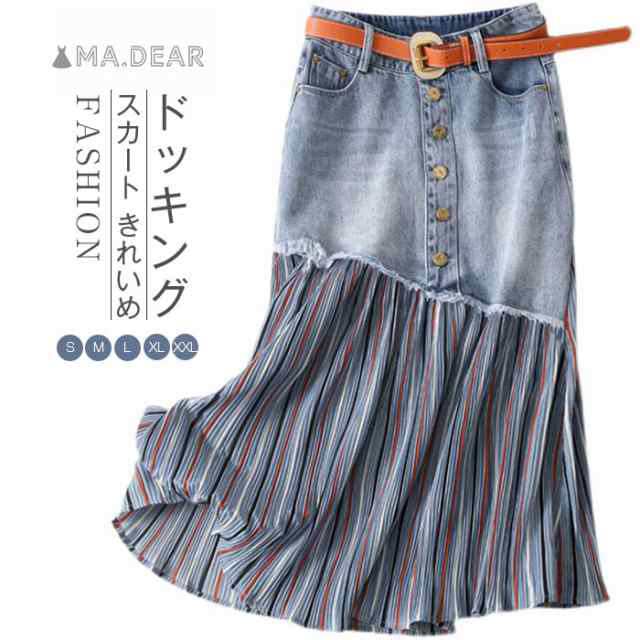送料無料 デニム スカート ロング 春 異素材 きれいめ ドッキング プリーツ スカート デニムスカート 異素材 フレアスカート 春 ハイウエスト フレア スカート ミドル丈 春秋 aラインスカート ボトムス 大きいサイズ 配色 体型カバー 着痩せ 美脚 通勤 上品 カジュアル