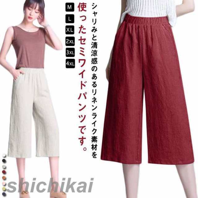 セミワイドパンツ 7分丈 レディース 綿麻調 吸汗速乾 ストレートパンツ クロップド丈 ハーフパンツ 膝下 ポケット付き リラックス ルームウェア 部屋着 涼しい ボトムス 春夏秋 黒 白 大きいサイズ