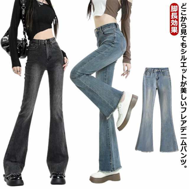 フレアパンツ デニムパンツ レディース ハイウエスト ジーンズ フレアデニム ブーツカット レトロ フリンジ 美脚 脚長効果 春秋 韓国ファッション ボトムス カジュアル 送料無料