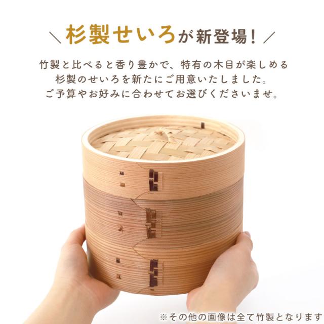 せいろは、軽やかで通気性に優れた「竹製」と、香りと高級感を楽しめる「杉製」の2タイプをご用意。