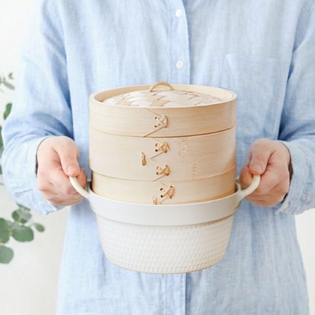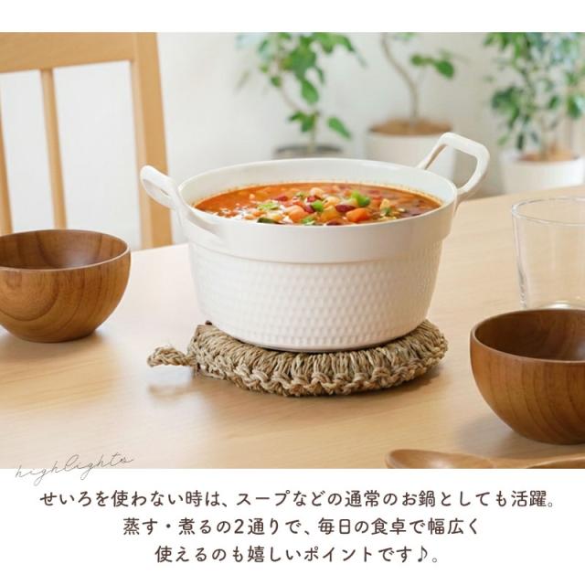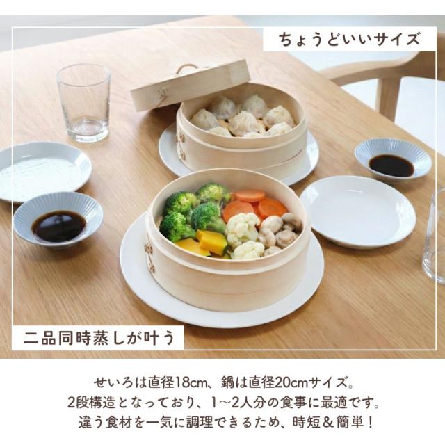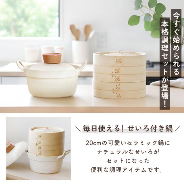 IHやガス火に対応した「セラミック鍋 20cm」に、天然素材のせいろ(蒸篭)がセットになった便利な調理アイテムです。