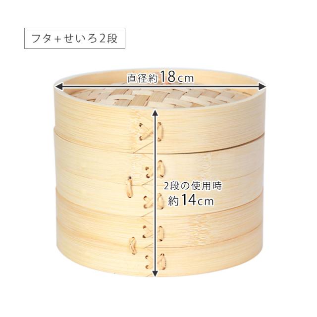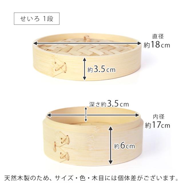 せいろ蓋:直径18cm×高さ3.5cm 本体1段分:直径18cm×高さ6cm(内径17cm×深さ3.5cm) 2段セット:直径18cm×高さ14cm 鍋:直径20×高さ12cm 深さ7cm(容量1.2リットル) |