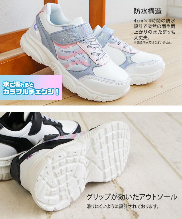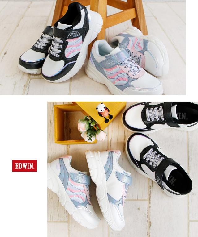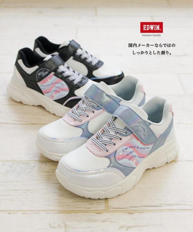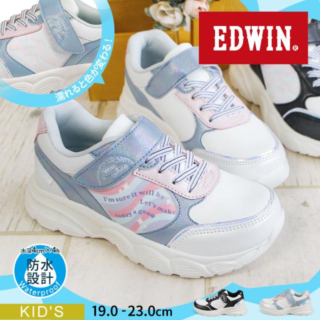 エドウィン 子供靴 靴 スニーカー 女の子 キッズ ジュニア 水に濡れると色が変わる 厚底 防水 軽量 面ファスナー 運動靴 ローカット ジュニア シューズ 黒 ブラック 白 ゴム紐 かわいい おしゃれ 幼稚園 小学生 通園 通学 edwin 3674