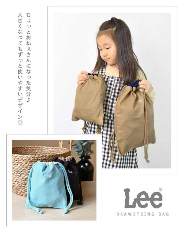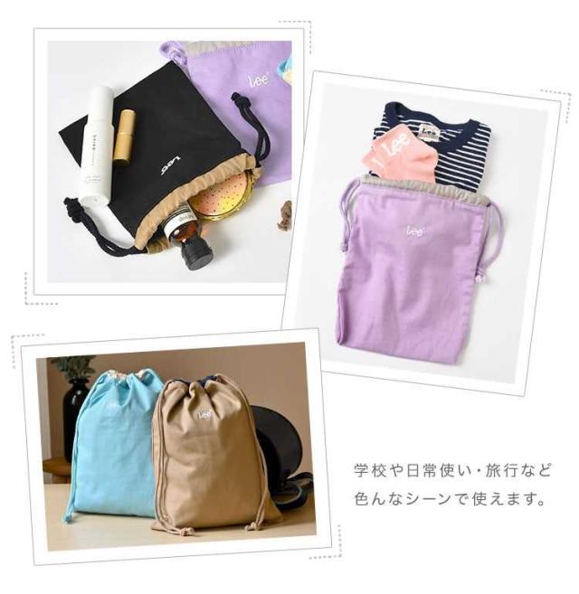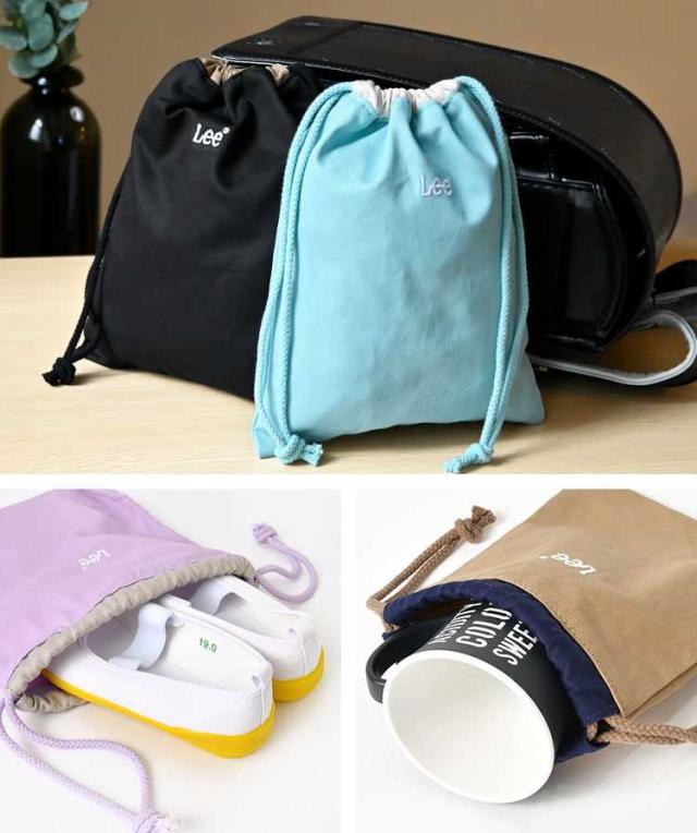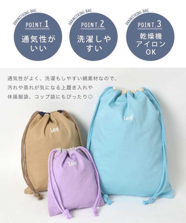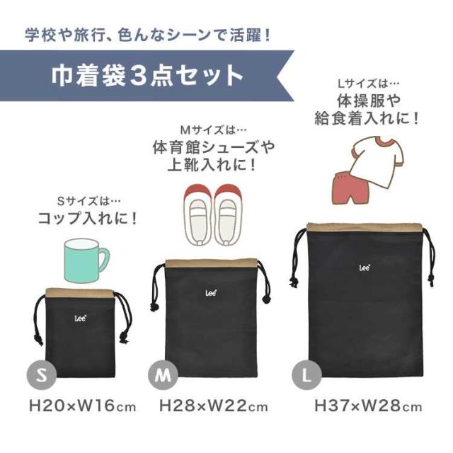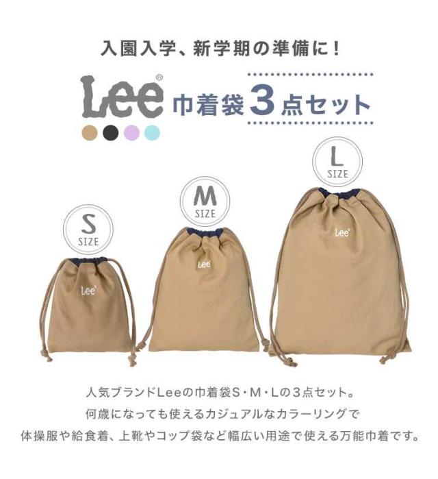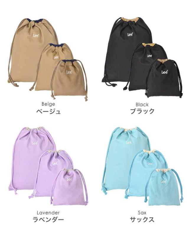 巾着袋 入園 入学 3点 セット Lee リー 巾着 ポーチ 大 中 小 女の子 男の子 小学生 シューズバッグ 上履き入れ 給食袋 コップ袋 体操服入れ 保育園 幼稚園 小学校 新学期 通園 通学 綿 洗える きんちゃく 子供 3枚セット ブランド ベージュ 黒 ブラック ラベンダー サックス
