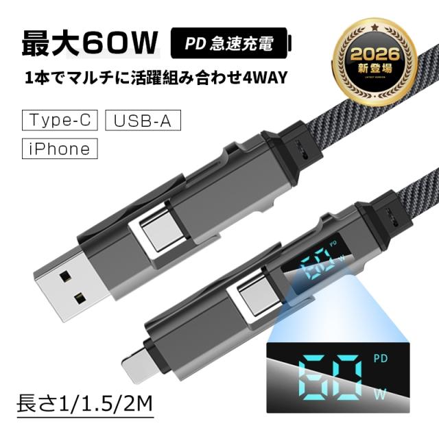4in1 USB充電ケーブル Type-C to Type-Cケーブル 1m/1.5m/2m【2026最新】iPhone15/16対応 Type-C/iPhone/USB-A 急速充電 高耐久ナイロン編み USB2.0 データ転送 480Mbps 高速データ通信 携帯便利 正規充電器対応 家庭 旅行 会社 テレワーク 【PL保険加入済み製品・安心】