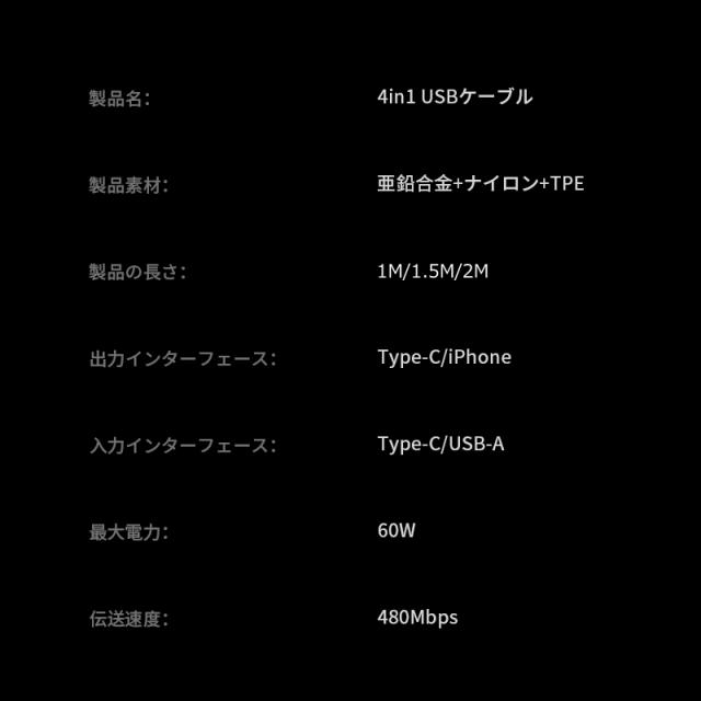 デバイスに合わせてコネクターを付け替えられる4in1 USBケーブルです。「USB-A to iPhone」「USB-A to Type-C」「Type-C to iPhone」「Type-C to Type-C」の4パターンで活躍がします。幅広い互換性で、iPhone・Android・モバイルバッテリーなどの様々な機器に対応し、これ1本で、様々なデバイスの充電やデータ転送の需要を満たします。複数のケーブルを用意する煩わしさを解消できます。