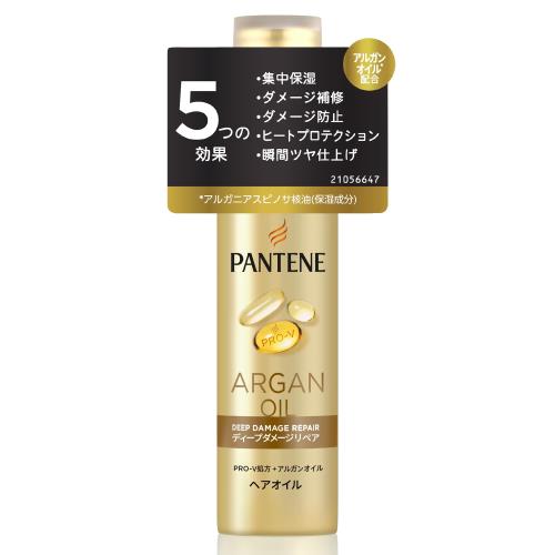 パンテーン ディープダメージリペア アルガンオイル * 配合ヘアオイル 70mL:5つの効果 集中保湿 ダメージ補修 ダメージ防止 ヒートプロテクション 瞬間ツヤ仕上げ ベタつかない。 甘い花々と爽やかな果実の香り。 * アルガニアスピノサ核油(保湿成分)