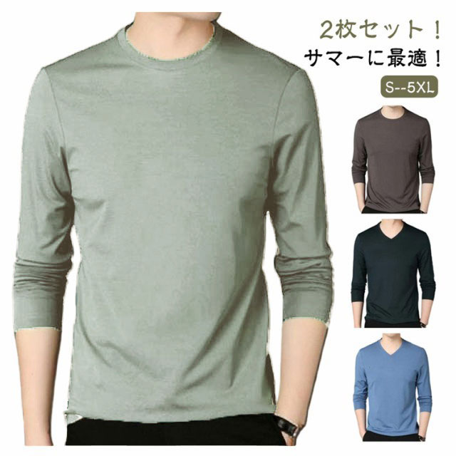 2枚セット 冷感インナー 長袖 メンズ tシャツ 夏 接触冷感 長袖 涼しい トップス アイスシルク 長袖tシャツ Tシャツ 薄手 ストレッチ 吸水速乾 丸首 Vネック インナーシャツ 作業服 作業着 トレーニングウェア ゴルフ 野球 大きいサイズ バイク 釣り キャンプ スポーツ S-5XL