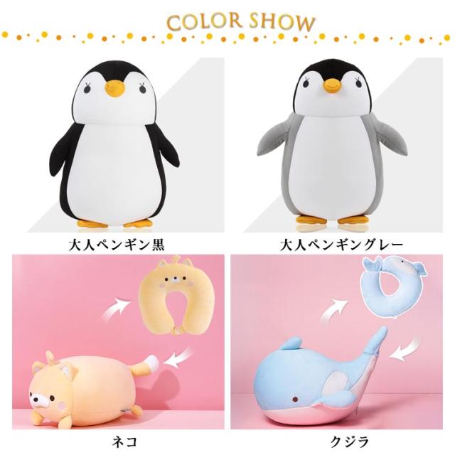 | サイズについての説明 | 【サイズ】 【大人ペンギン】30×30cm 【ネコ】16×26cm ネックピロー:30×28cm 【クジラ】30×24cm ネックピロー:30×30cm 【シロクマ】40×18cm ネックピロー:30×32cm 【キッズペンギン】12×22cm ネックピロー:22×24cm 【ウサギ】35×18×15cm ネックピロー:30×30×12cm 【ライオン】40×18×15cm ネックピロー:30×30×12cm 【クマ】25×25×12cm ネックピロー:30×30×12cm ※上記サイズは平置き実寸になります。 サイズ表の実寸法は商品によって1-3cm程度の誤差がある場合がございます。 |