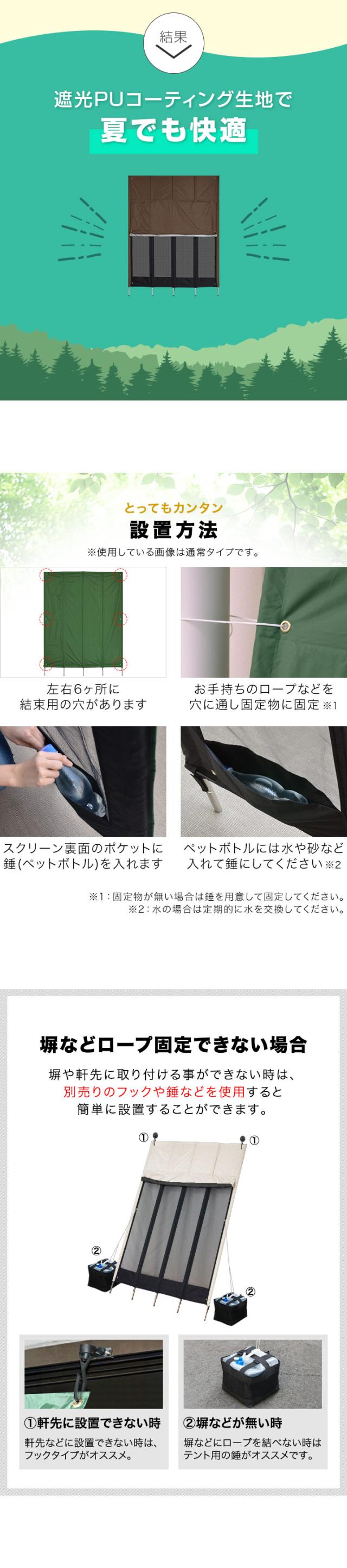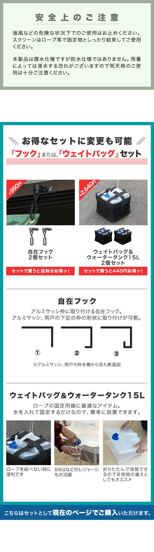 | 特記事項: ※こちらの商品にはロープ・錘は付属いたしません。 ※日よけスクリーンの設置は、必ず固定物と固定、もしくは錘で固定してください。 ※設置は安全のため2人以上で行ってください。 |