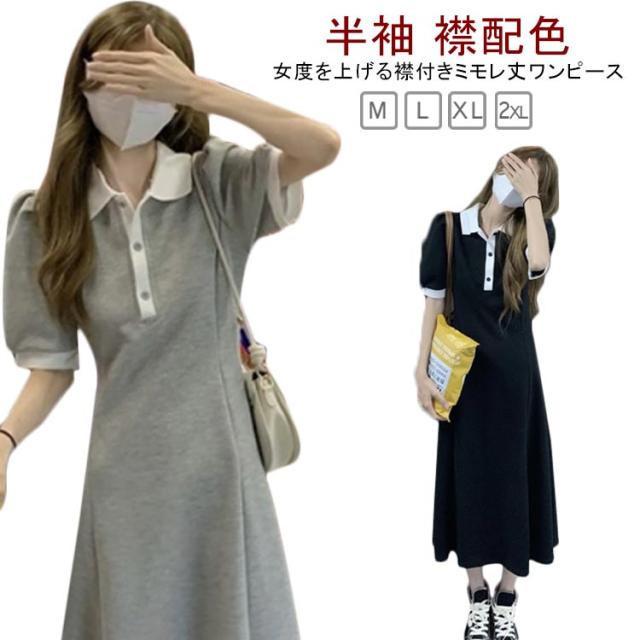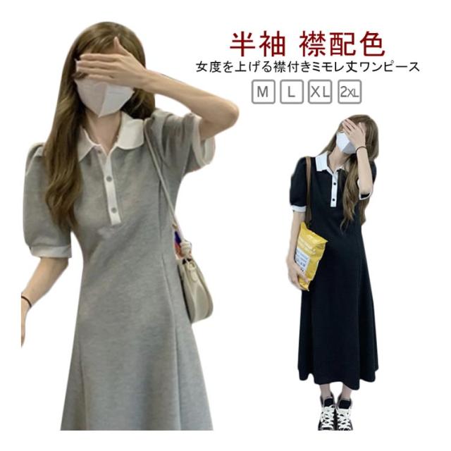ロングワンピース 大きいサイズ ワンピース 春 ポロシャツ 襟配色 襟付き 半袖 夏 カフス付き ミモレ丈 お嬢様 大人可愛い ミモレ丈 ミモレ丈 ロング丈 無地 フレア ワンピース フレアワンピース シンプルデザイン 通勤 パフスリーブ スポーティー