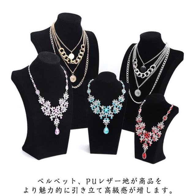 | アクセサリーを綺麗に展示できるディスプレイトルソーです。 ネックレス・チョーカー・ペンダントだけでなくイヤリングもかける事ができます。 胸元の曲線をデザインしておりカラーはブラックでジュエリーの魅力を引き立てます。 ベルベット、PUレザー地が商品をより魅力的に引き立て高級感が増します。 店舗の展示はもちろん、ネットショップ・ネットオークションの写真撮影やご自宅でのジュエリーディスプレイなど様々な用途にオススメです。 かけるだけで綺麗にディスプレイできるのでご自宅での普段使いにもピッタリです。 展示会やフリーマーケットはもちろん、撮影用のアイテムとしてもご使用いただけます。 | |