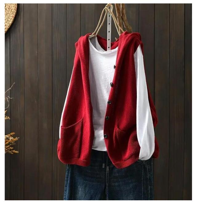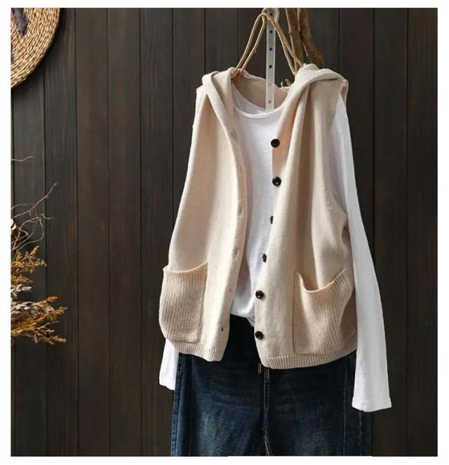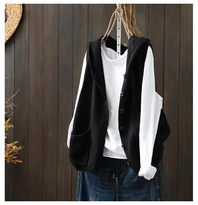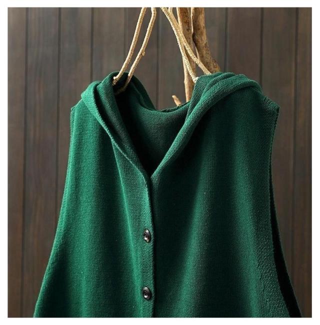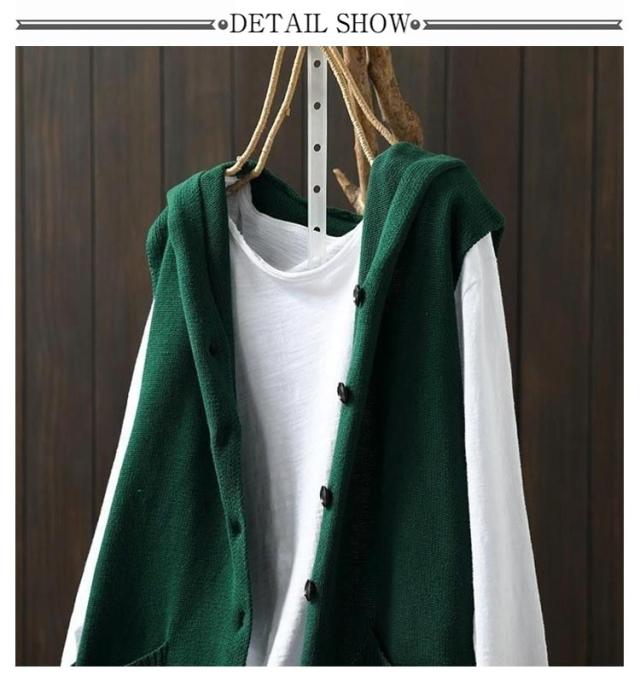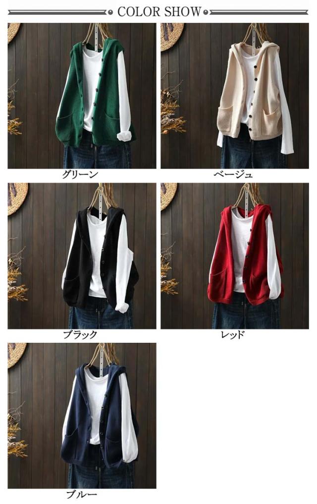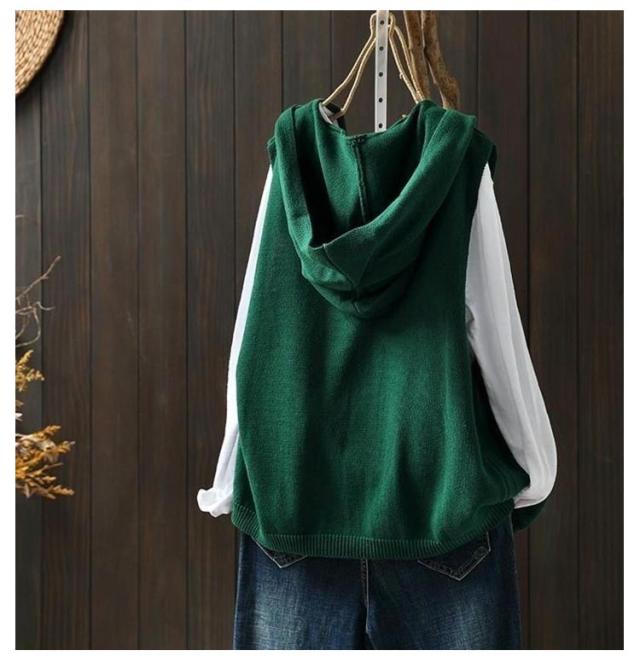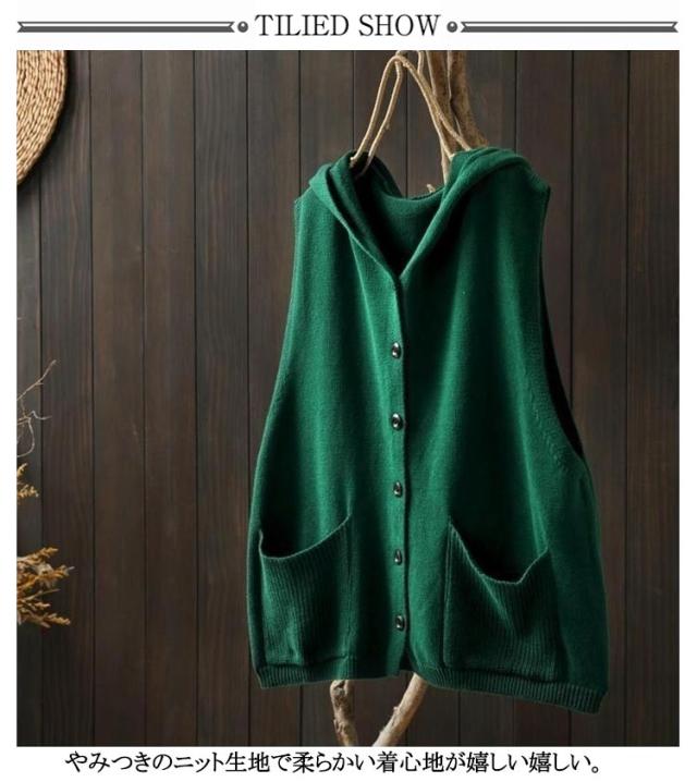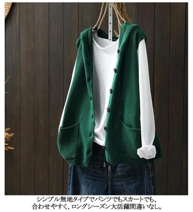 おしゃれ ニットフードベスト ノースリーブ ニットパーカー 重ね着 緑 ベスト 前開き パーカー ポケット付き ニット カーディガン ニットベスト レディース ゆったり レイヤード トップス お洒落 可愛い ニットベスト ベージュ 黒 紺色 春 秋