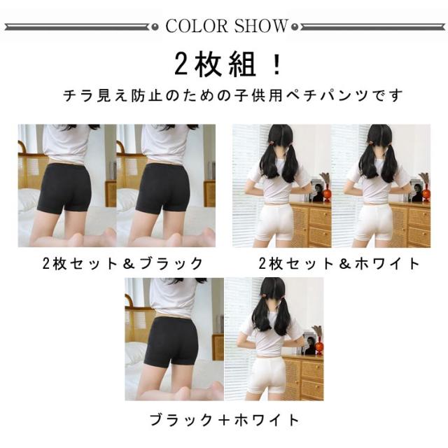 | 2枚組!チラ見え防止のための子供用ペチパンツです ワンピースやチュニック、ミニスカートのインナーパンツにぴったり! 滑らかな肌触りと伸縮性のありの履き心地のショート丈レギンス! シンプルなデザインとカラーで、合わせやすい! | |