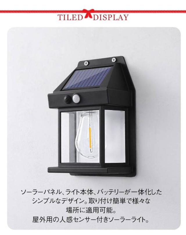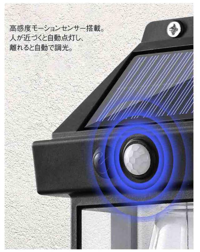 | 屋外用の人感センサー付きソーラーライト。 高効率ソーラーパネル搭載。昼間に自動充電し、夜間に点灯。省エネで配線不要。 ソーラーパネル、ライト本体、バッテリーが一体化したシンプルなデザイン。取り付け簡単で様々な場所に適用可能。 高感度モーションセンサー搭載。人が近づくと自動点灯し、離れると自動で調光。 IP65防水素材を採用することによって、雨に濡れても平気! ガーデン、廊下、表札、通路、ポスト、駐車場など様々な所に大活躍です。 | |