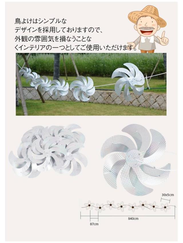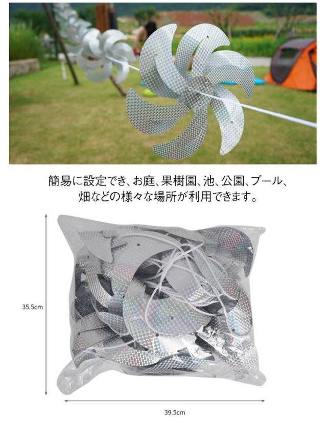 | アウトドア用の鳥除け回転タイプの風車. 太陽光を強く反射することで鳥を脅かして寄せ付けません! 鳥よけはシンプルなデザインを採用しておりますので、外観の雰囲気を損なうことなくインテリアの一つとしてご使用いただけます。 太くて厚手のナイロンロープは、高強度あり、優れた摩耗抵抗力と引裂き耐性を備えています。 風車の前後に結び目が付けられており、強風で風車が乱れて飛ばされるのを防ぎます。または、風車の間隔も調整可能。 簡易に設定でき、お庭、果樹園、池、公園、プール、畑などの様々な場所が利用できます。 | |