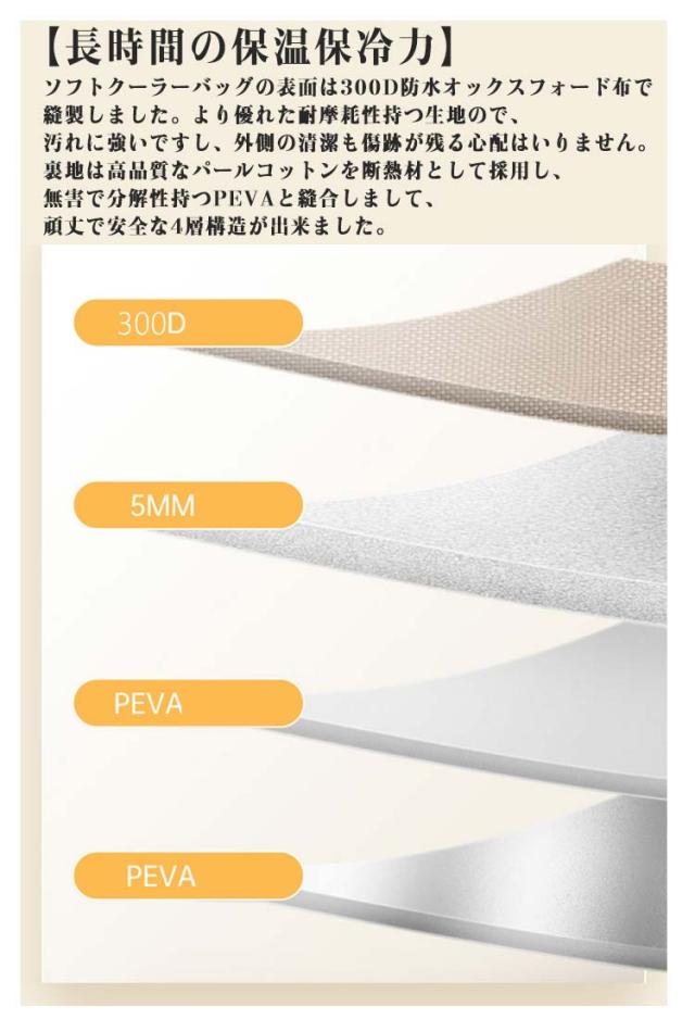 | 【保冷バッグ大容量】タップリ入れる大型クーラーボックス。折り畳み保冷バッグが使わない時にも負担になりません。 【長時間の保温保冷力】ソフトクーラーバッグの表面は300D防水オックスフォード布で縫製しました。より優れた耐摩耗性持つ生地ので、汚れに強いですし、外側の清潔も傷跡が残る心配はいりません。裏地は高品質なパールコットンを断熱材として採用し、無害で分解性持つPEVAと縫合しまして、頑丈で安全な4層構造が出来ました。厳密な加工済防水素材は内から外までの漏れを防止できます。アルミ蒸着フォイル付き蓋と優秀な気密性は保温、保冷を確保できます。保冷バッグはアイスバッグと合わせて使えば、8-24時間の保冷も可能です。 【より快適な使いに】無地でシンプルなデザインと丁度良いサイズ、男性も女性も使えます。このソフトクーラーのショルダーベルトは取り外せるだけでなく、長さの調整も可能です。手提げ・肩掛け・斜め掛け、お使いいただくお方々は一番気楽な持ち方が探せます。大容量ランチバッグの両サイドは網袋が付く、更にジッパー付くフロントポケットはより安全な収納を保証できます。財布、小銭、鍵、携帯、餌、色々な小物の失くすことが心配無用です。 【色んなシーンにピッタリ】軽量で折り畳み可能、大型クーラーボックスとしては多種多様な場合に相応しいです。デパートやスーパーで買い物をする時は、肉、海産物、果物と野菜の鮮度を保つことができます。キャンプ、BBQ、パーティー、キャンプ、人数が多いイベントに酒と飲み物を冷やす容器にもなれます。優れた防水性能付き故、釣りクーラーボックスとしても完全OKです。 | |