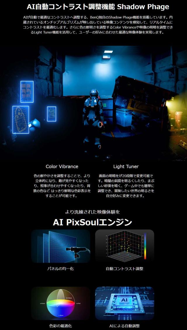 ●優れた輝度、VESA DisplayHDR 400の高コントラスト、広い色域(DCI-P3 95%のカバー)を実現●PixSoulエンジン搭載を搭載、AIが独自のアルゴリズムに基づき、コンテンツや環境に合わせて色味を自動調整するShadow Phage機能