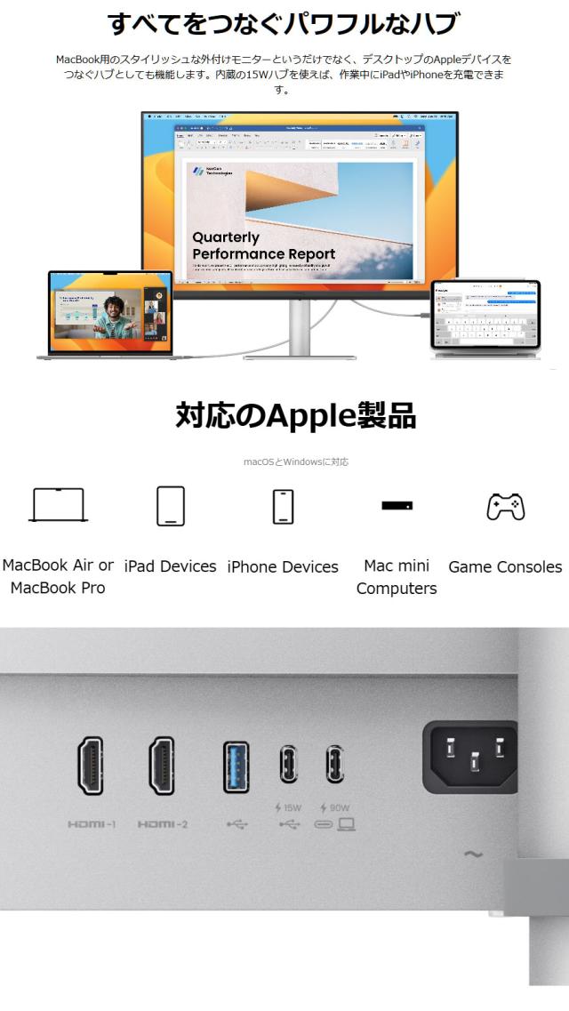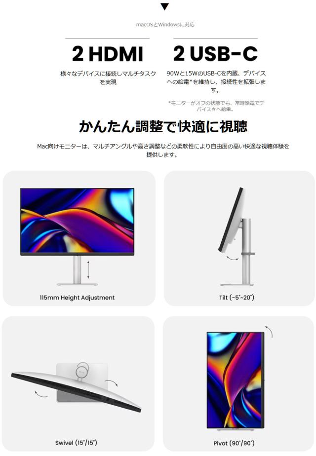 USB-C ケーブル1本でMac画面を拡張。MacBookからMac画面とモニターの輝度や音量を調整。90Wと15W給電のUSB-Cポートを搭載