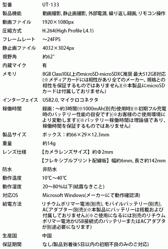 UT-133 | フルHD録画対応基板(基盤)ユニット小型カメラ