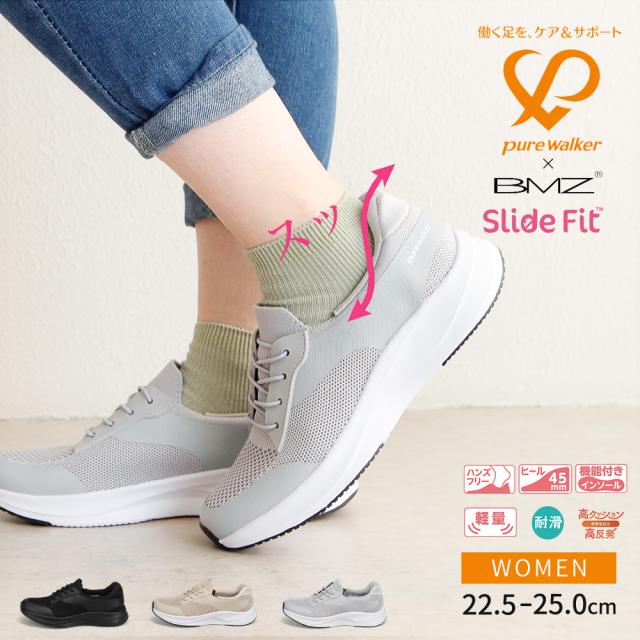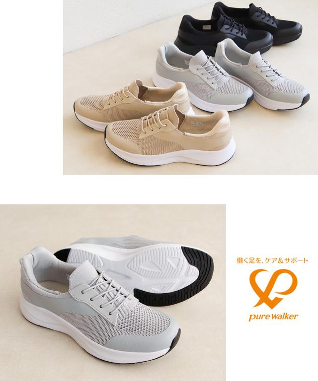 Pure Walker スニーカー レディース 黒 ローカット 手を使わず履ける 履きやすい 高反発ソール 軽い 厚底 4.5cmヒール 美脚 腰痛軽減 肩こり軽減 姿勢サポート 看護 介護 ウォーキング 美脚効果 ピュアウォーカー ブラック グレー ベージュ 1701