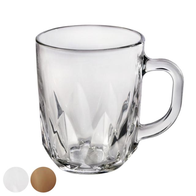 グラスのカットデザインが美しい光を演出してくれるマグカップです。持ち手付きなので持ちやすく、HOTでもICEでも使える耐熱性なので一年中お使いいただけるアイテムです。食洗機対応で、お手入れも簡単です。
