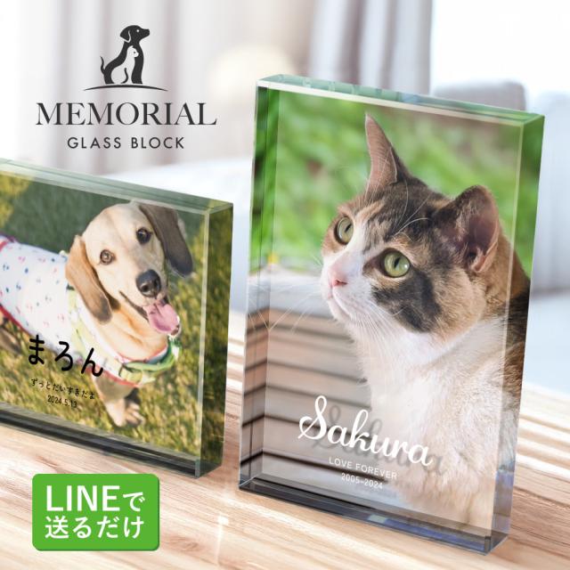 ペットのメモリアルガラスブロック ? 大切な思い出を永遠に 愛するペットとのかけがえのない時間を、美しいガラスブロックに刻みませんか 高級感のあるダイヤカット仕上げと立体的なプリントが特徴のメモリアルガラスブロック。 写真と名前、メッセージを添えて、世界に一つだけの特別な記念品をお作りします。 厚みのあるガラスが上品な光を取り込み、どの角度から見ても美しく映えるデザイン。 インテリアとしても洗練された印象を与え、お部屋に溶け込みながら大切な記憶をそっと彩ります。 大切なペットへの「ありがとう」の気持ちを、美しいガラスブロックに込めて。 ぜひ、この特別なメモリアルグッズをお迎えください。 | ||||||