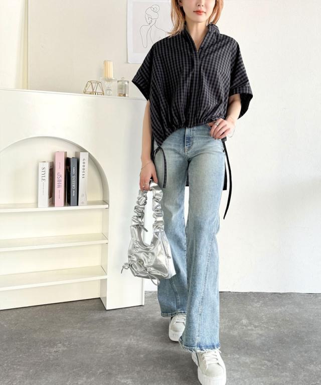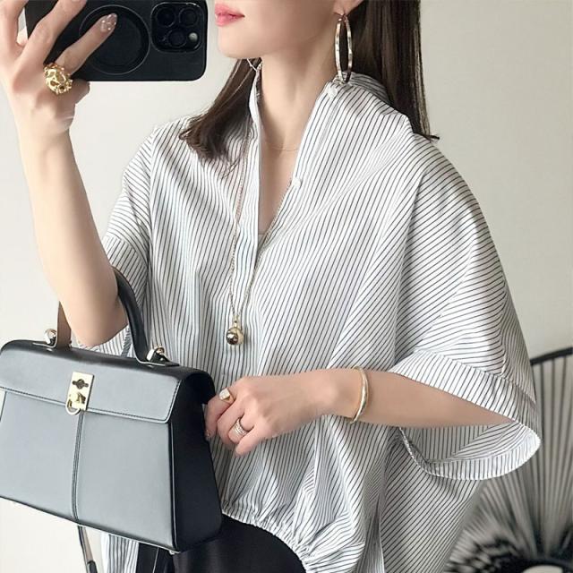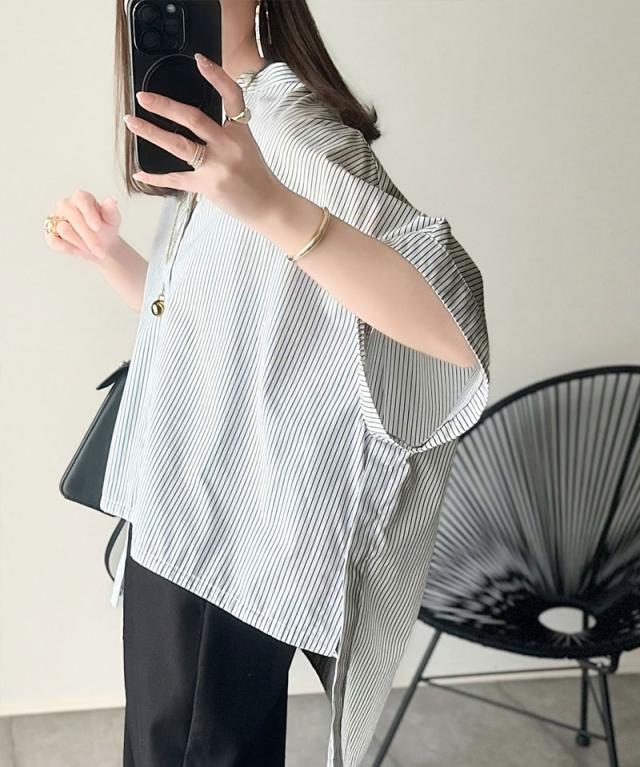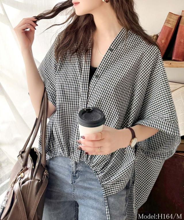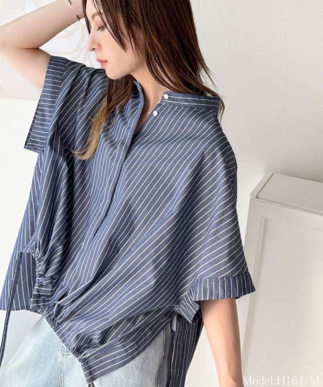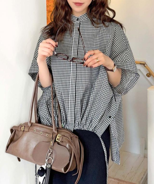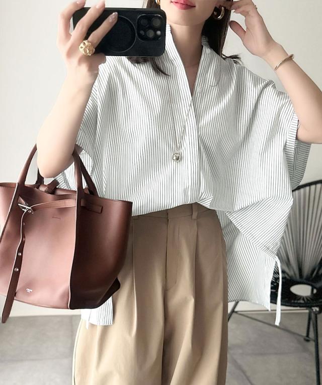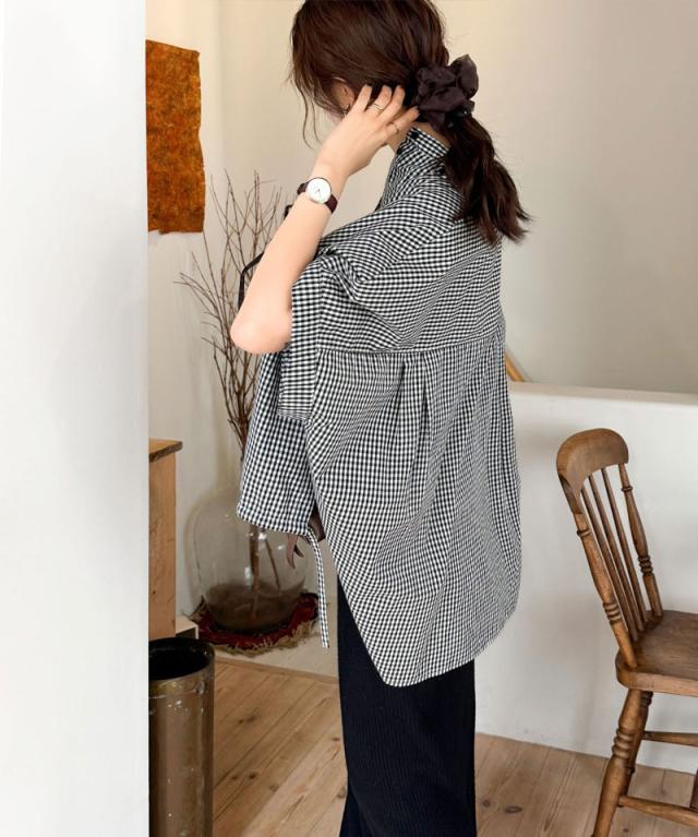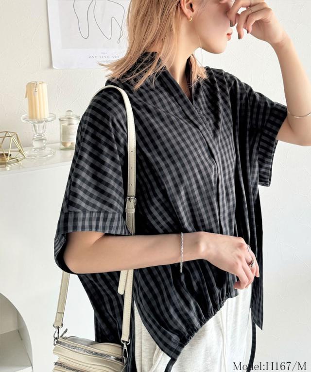 ★一枚で映える!サイドボタンスリットドロスト半袖バンドカラーオーバーシャツ(ストライプ/ギンガムチェック)★