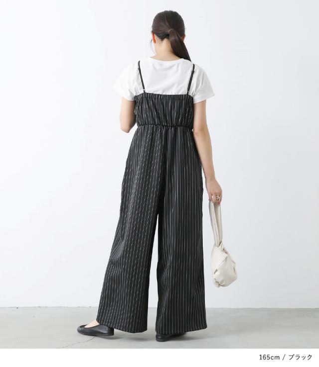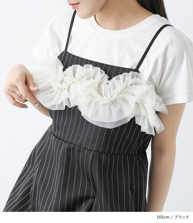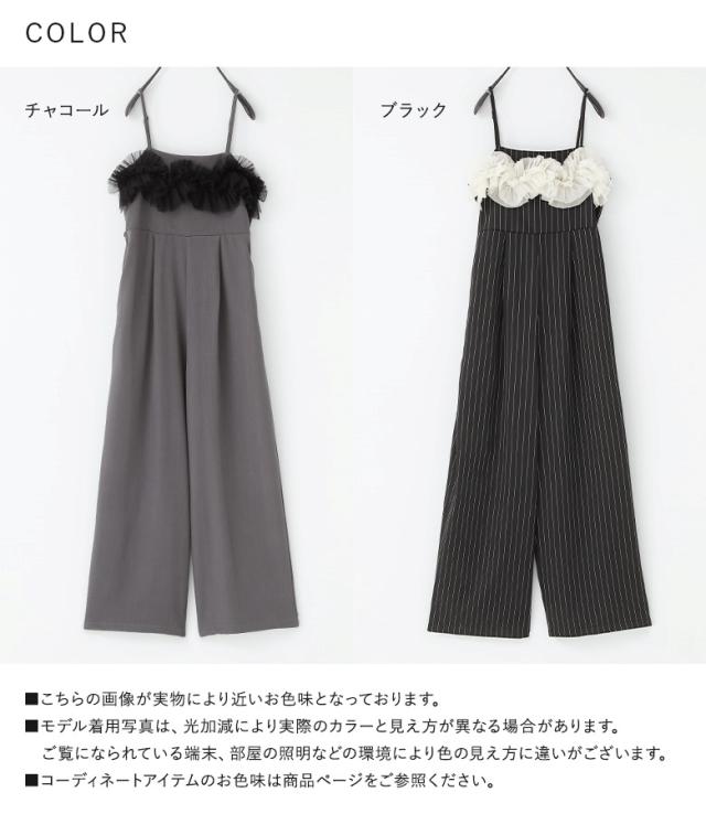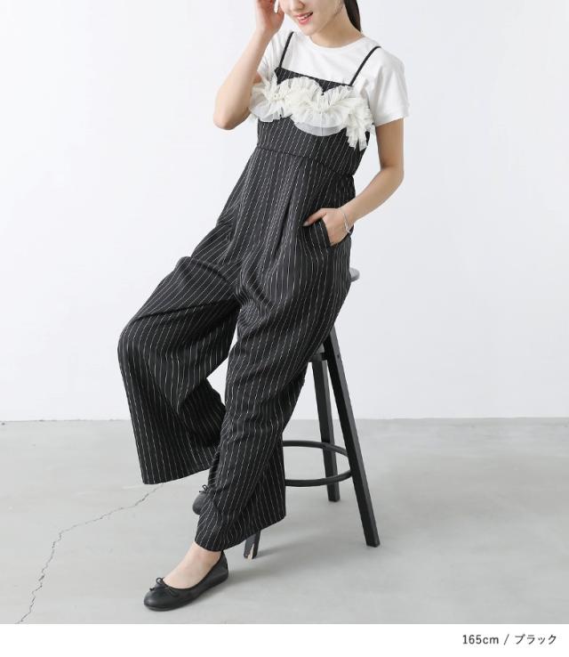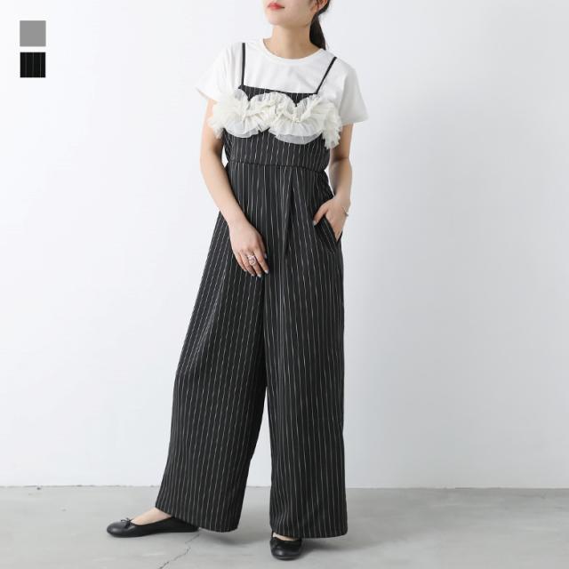 『チュールドッキングオールインワン』【メール便不可】【30】[サロペット レディース オールインワン ロング丈 パンツ サロペ キャミ チュール ストライプ フリル 春 夏]