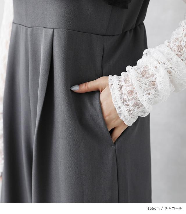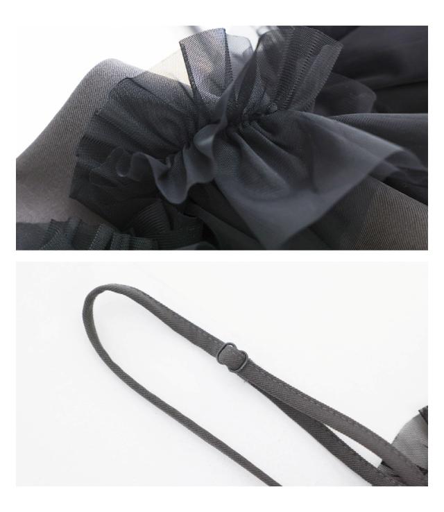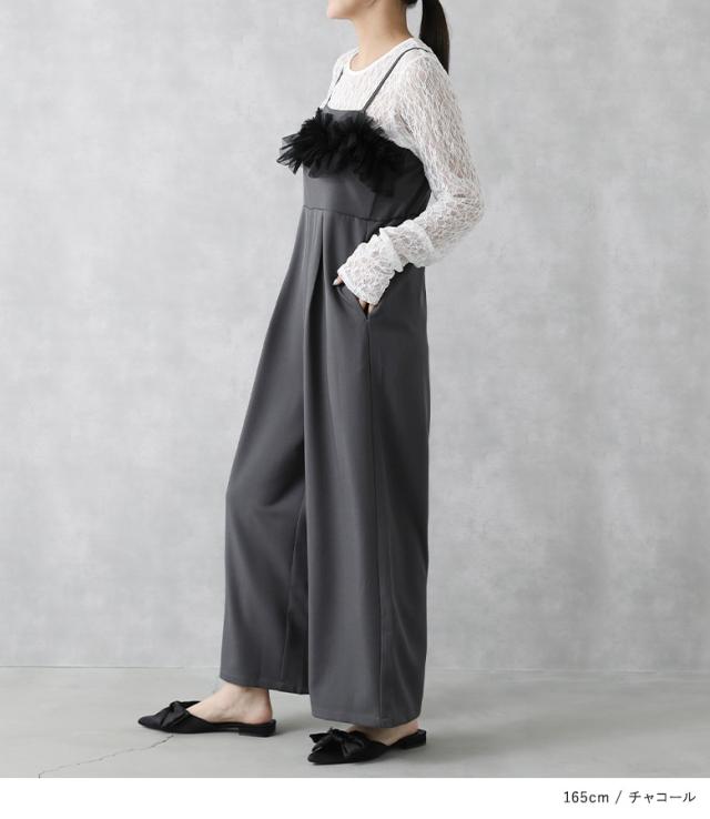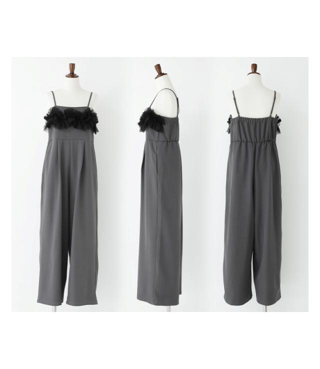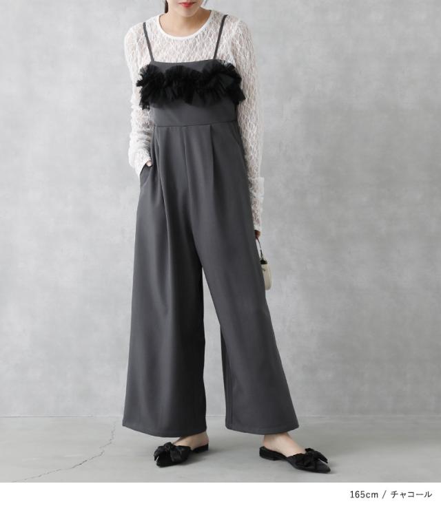■デザイン 胸元にチュールフリルがドッキングされたオールインワン。華やかさがありながらも、シックなカラーで甘くなりすぎず、洗練された印象をプラスできる一枚です。 ■コーディネート 一枚で華やかな印象をプラスできるので、デイリーだけではなくオケージョンシーンでも活躍します。季節に合わせてインナーを変えることでロングシーズン着こなせるアイテムです。 ■素材 さらりとした肌触りのポリエステル素材を使用。チュール部分には、シアー素材を使用し抜け感をプラスしています。程よい厚みのため、合わせるインナー次第でロングシーズンご着用いただけます。 |