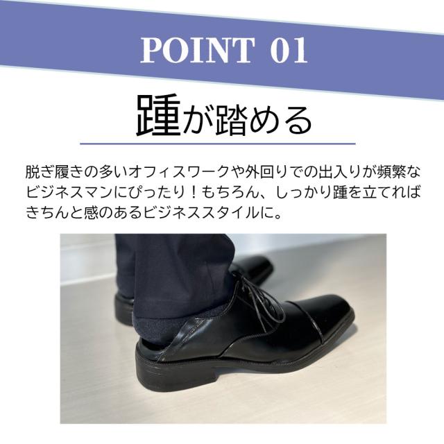 デスクワークなどリラックスしたい場面では、かかとを踏んでスリッポン感覚に。外出時はかかとを立てて、きちんとしたビジネススタイルに。TPOに合わせて、自由に履き方を変えられます。