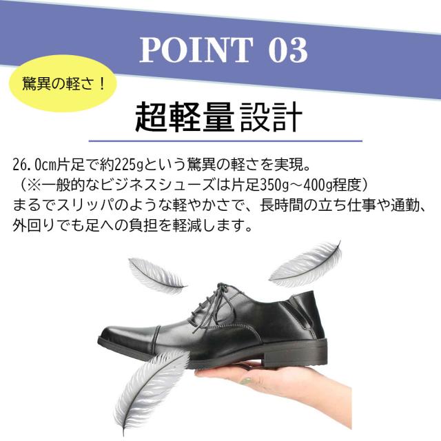 片足約225gの超軽量設計で、一般的なビジネスシューズより約100g以上も軽量。長時間の通勤や外回りでも、足への負担を軽減します。
