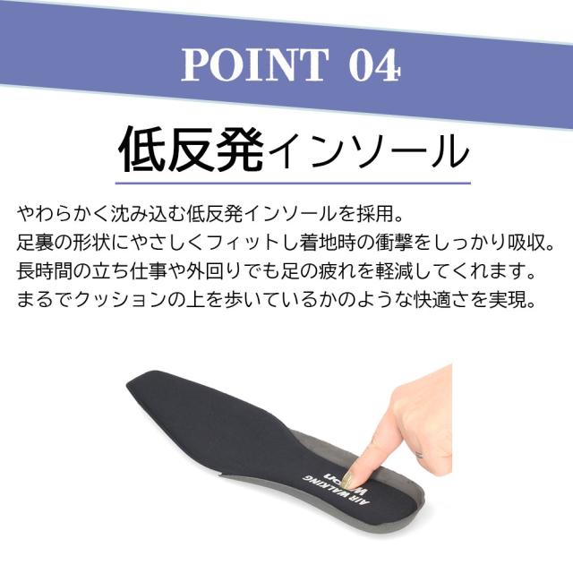 さらに、低反発インソールが足裏の衝撃を吸収し、一日中快適な履き心地をキープ。