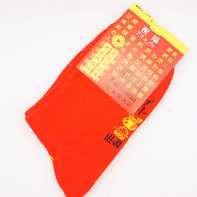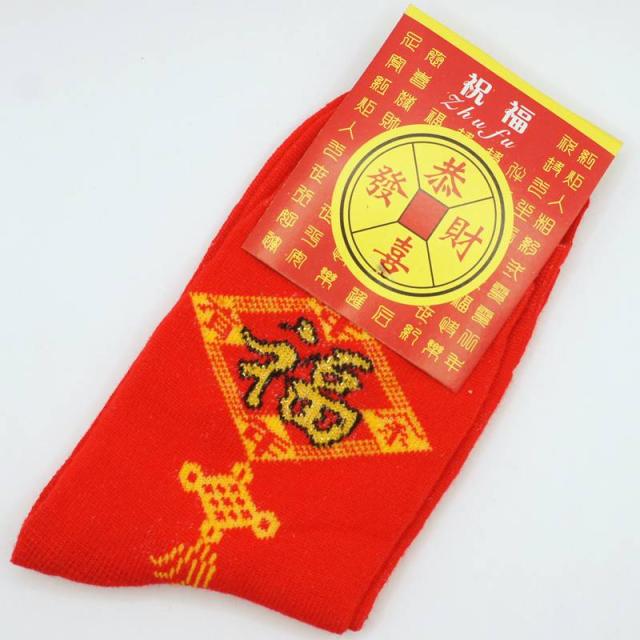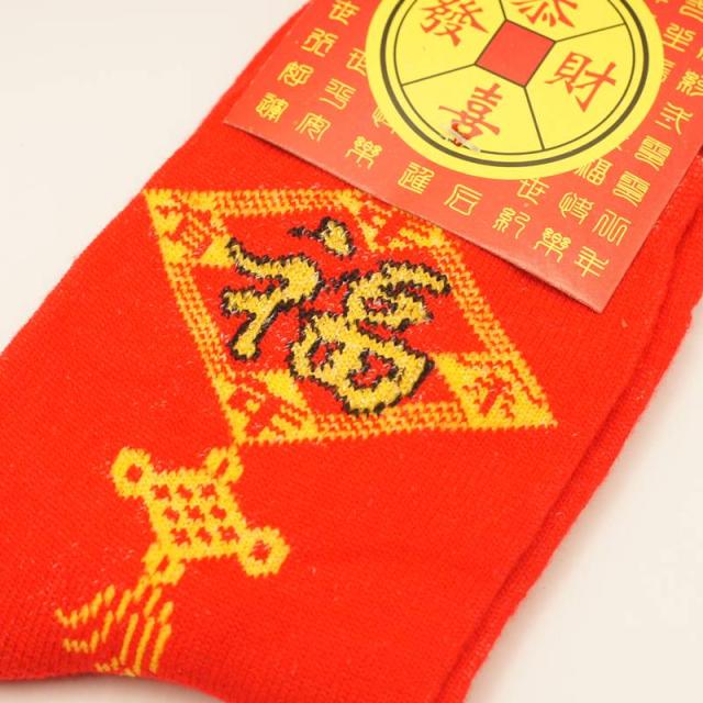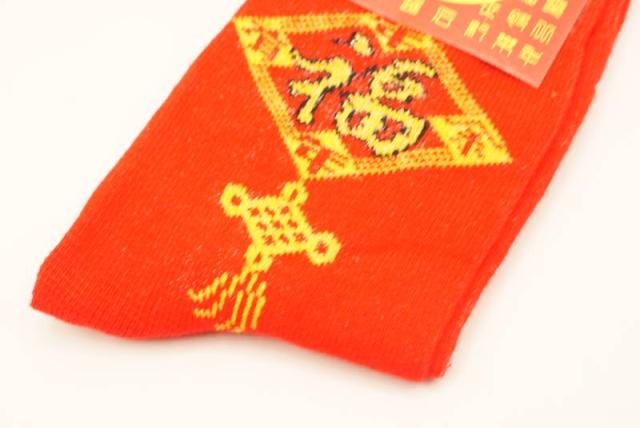 中国で断トツに縁起のいい文字は「福」であり、人生に幸福を招く吉祥のデザインとして多くの飾りに利用されており、その文字を大きくワンポイントであしらったソックスです。
