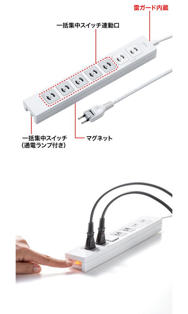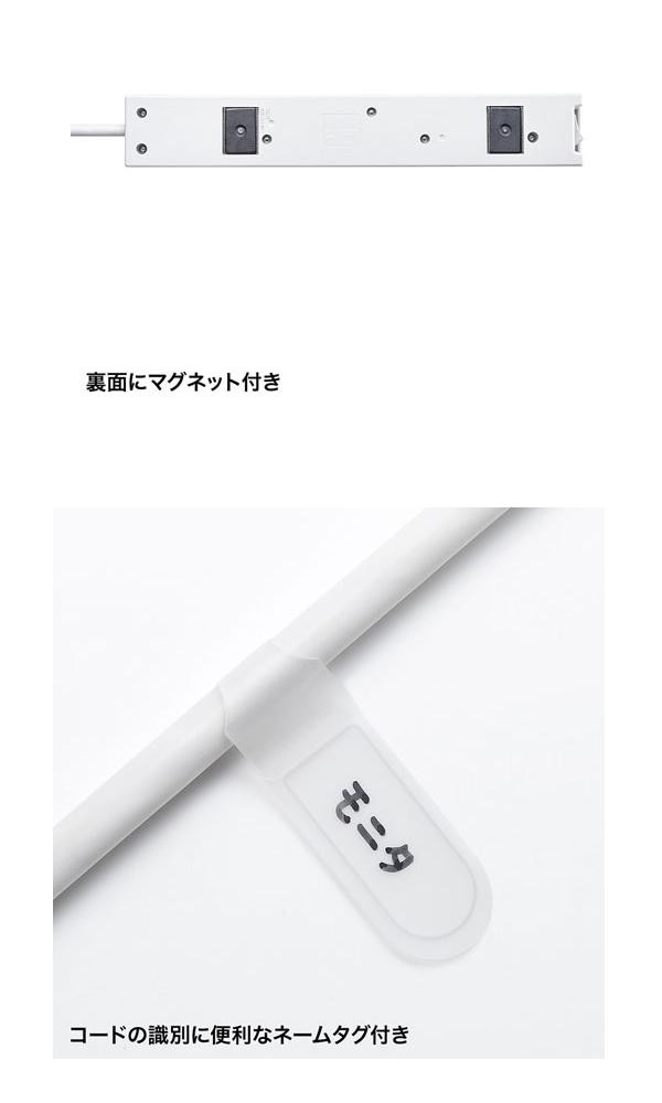2P抜け止め7個口、集中スイッチ、マグネット、雷ガード付き。ネームタグ、専用コンセントキャップ付属の電源タップ。コード長5m。 |