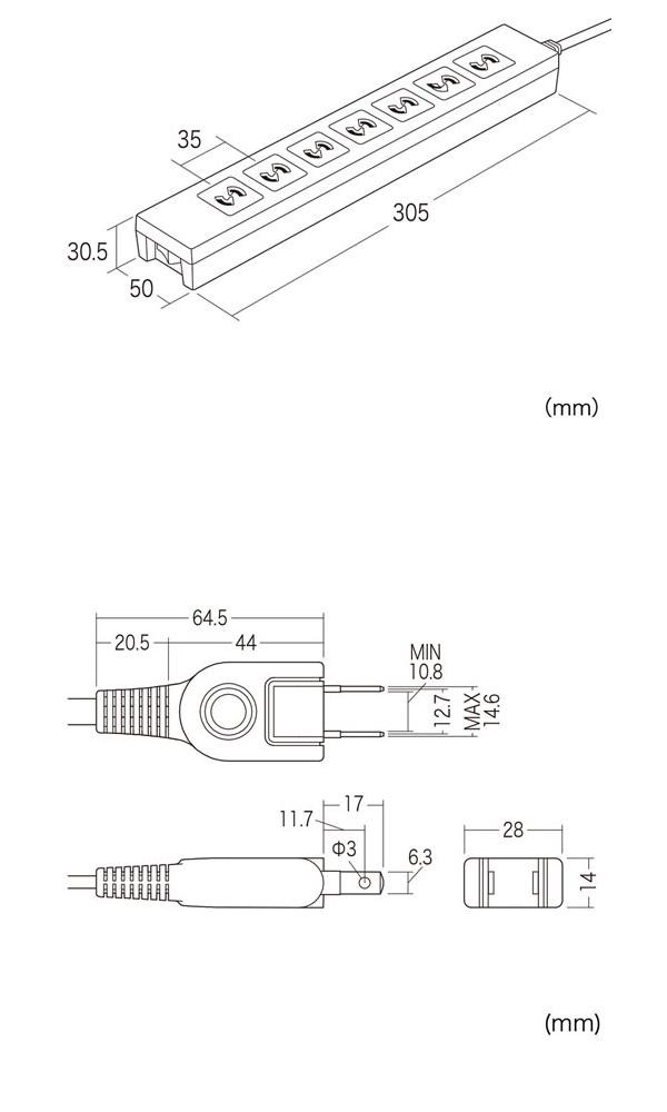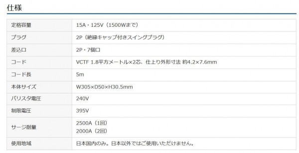 | 2P抜け止め7個口、集中スイッチ、マグネット、雷ガード付き。ネームタグ、専用コンセントキャップ付属の電源タップ。コード長5m。 |