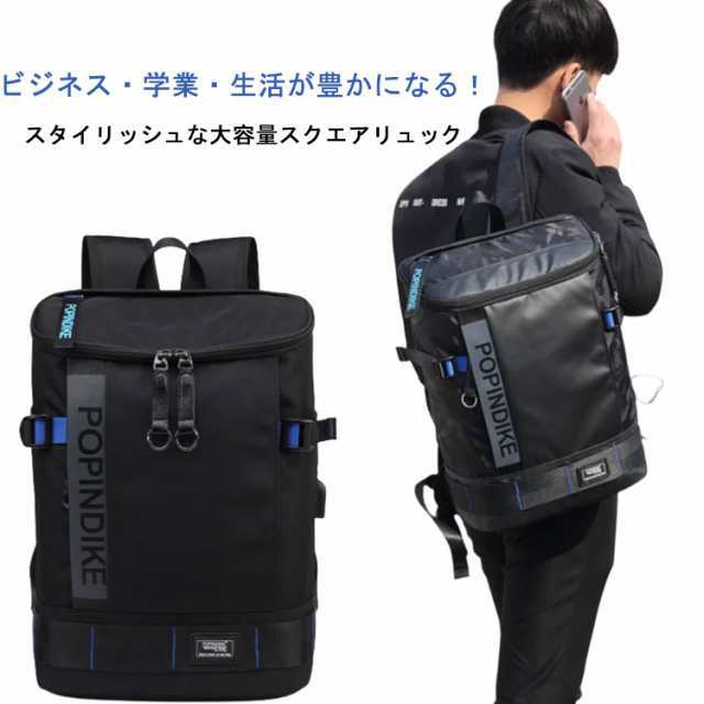 A4サイズ USBポート付き ボックス型 スクエアリュック 通学 リュック 撥水 大容量 バックパック 15.6インチPC収納 ブラック キッズ 中高