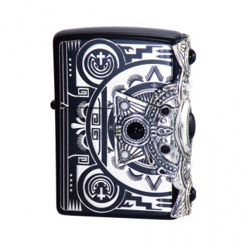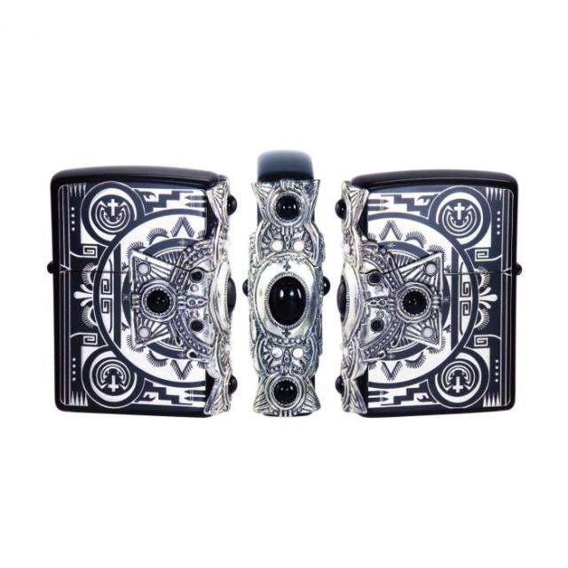 イオンブラックとニッケルのコンビメッキに、黒く輝く天然石オニキス・白く輝くハウライトを装飾した、重厚感あふれるメタルZippoです。