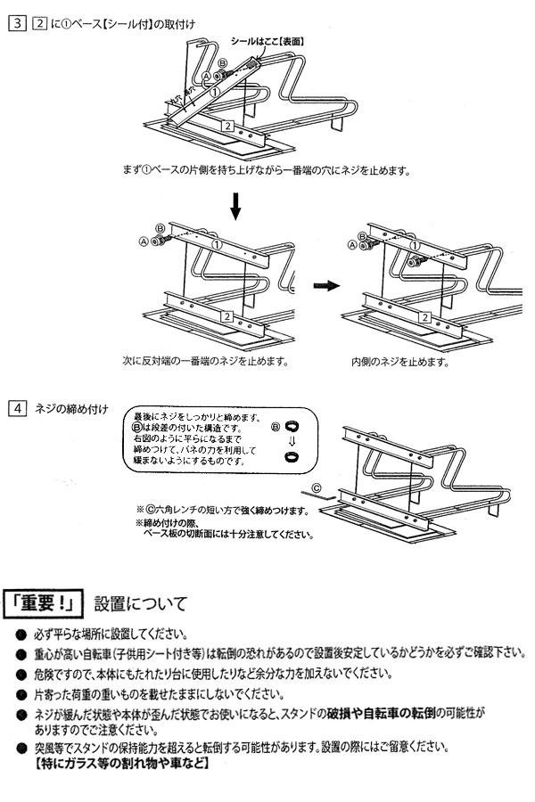 | 仕様 | 組立式 【収容可能タイヤサイズ】 上段:20〜28インチ 下段:16〜28インチ タイヤ幅5cm以下 ※自転車の前カゴの形状によっては収納できない場合あり。 |
