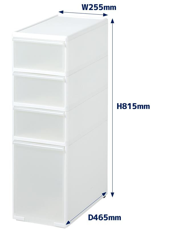 | サイズ | 【外寸】(約)W255×D465×H815mm、【内寸/上から】1・2・3段目:(約)W213×D431×H120mm、4段目:(約)W213×D405×H308mm 個装サイズ:47×26×82cm |