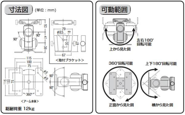 | 仕様 | 総耐荷重:12kg ※12kgまでのディスプレイ(24型程度までを想定)を取り付け可能 |