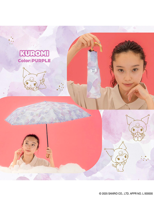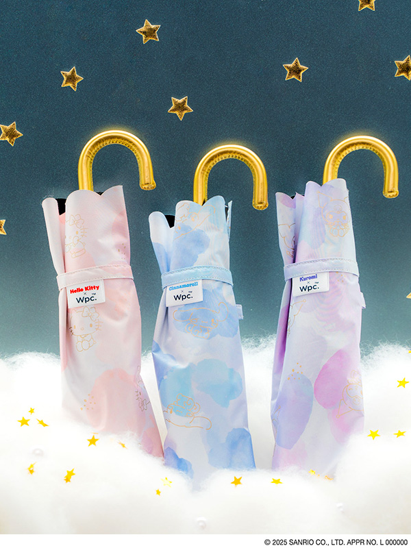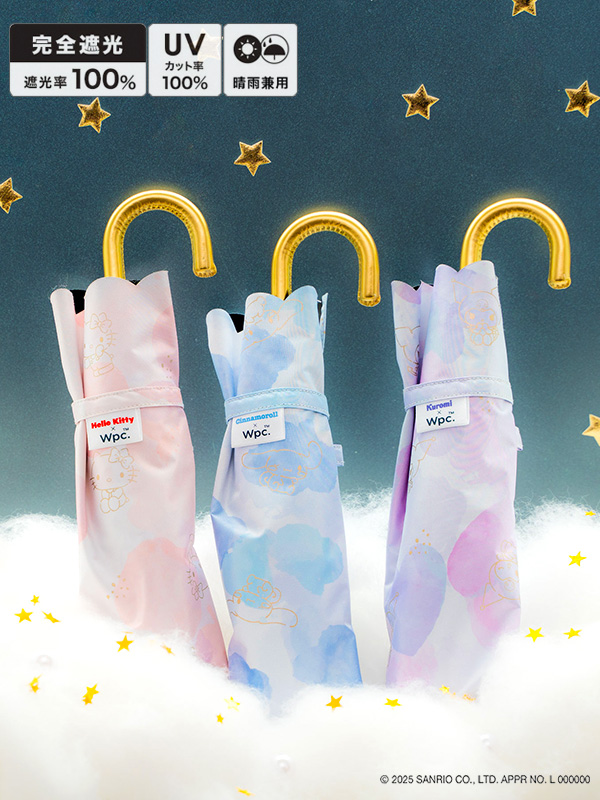 Wpc Sanrio Characters Shading Watercolor Motif Mini Parasol Wpc サンリオキャラクターズ 遮光 水彩モチーフ ミニ 日傘 【Wpc(ダブルピーシー)】 「新たな可能性を生み出す」をスローガンに2004年に誕生したドメスティックブランド。 様々な世代・ジャンルに合った方へ、雨の日だけでなく、天気によって変わる”ライフスタイリング”を提案していきます。 そして。ご愛用いただけるお客様の毎日が楽しくなる製品をお届けします。 淡いパステルカラーとスカラップのフチがポイント!大人可愛いサンリオキャラクターズの折りたたみ日傘♪ ハローキティ、シナモロール、クロミがかわいい水彩モチーフの折りたたみ日傘に! ゴールドのラインで描かれたサンリオキャラクターズが、光や角度によってキラリと光るお洒落なデザイン♪ なみなみスカラップのフチがかわいく、ゴールドの持ち手で上品な印象に! シナモロールは雲、ハローキティーはりんご、クロミはハートをモチーフにデザインされています。 晴れの日も雨の日もいつでも使える、機能性も抜群の日傘です。 3段式の骨を採用した折りたたみ傘。 曲がり手元で持ちやすい。傘の出し入れがしやすいよう、収納袋にはゆとりを持たせています。 【完全遮光日傘】 ■遮光率・UVカット率・ブルーライトカット率100%、UPF50+ 全カラー遮光率・UVカット率・ブルーライトカット率100%、UPF50+を実現しました。 日焼けを防ぐために必要なUVカットと、お肌に悪影響を与えるブルーライトカットの性能を兼ね揃えた生地を使用しています。 また涼しく過ごすための遮熱性も優れているため、暑い夏の熱中症対策にも。 ■傘内側の黒コーティングが照り返された紫外線、ブルーライトを9割吸収 傘の内側で起こる光の反射を大幅に減らして肌にダメージを与える有害光線からお肌を守ります。 ※記載の遮光率・紫外線遮蔽(UVカット)率・ブルーライトカット率、UPF値は生地の状態での測定値です。 傘本体の性能を示す数値ではございません。 また、生地に施された刺繍・縫製などUV加工生地以外の部分もその限りではありません。 ※ブルーライトは可視光線遮蔽率を計測(分光光度計法/可視光線遮蔽率(400〜780nm))した数値、 可視光線吸収率を計測(分光分析/可視光線(400〜780nm)透過率・反射率より算出)した数値に基づく。 ※直接肌に照り返された光を吸収するものではありません。日焼け止め等、他のUVケア用品との併用をお勧めします。 【雨の日も使える日傘(晴雨兼用)】 この製品は日傘としてお使い頂くことを主としていますが、はっ水防水加工を施しているため雨傘としてもお使いいただけます。 ※激しい雨や長時間の雨傘としてのご使用は雨漏りや色落ちの原因となる可能性がございます。またデザインの特性上、完全な防水はっ水加工が難しい場合があり、雨が染み込むことがありますのでご注意ください。 ≪開閉方法≫ 手開き(イージーオープン)仕様。ポキポキ折らずにスムーズに開閉できます。 ご使用になる前に製品に付属しているご使用上の注意をお読みください。 | ||||||||||