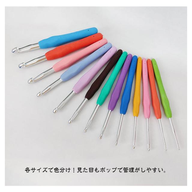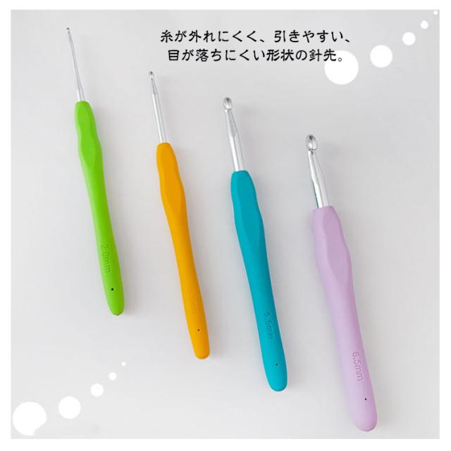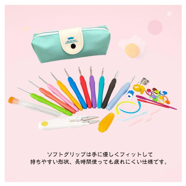 | かわいい専用ポーチ付きかぎ針セット初心者も嬉しい、かぎ針編み道具36点のお得なセットです。 ソフトグリップは手に優しくフィットして持ちやすい形状、長時間使っても疲れにくい仕様です。 糸が外れにくく、引きやすい、目が落ちにくい形状の針先。 各サイズで色分け!見た目もポップで管理がしやすい。 号数の表記が掘ってあるため、擦れ消えて太さがわからなくなることがありません。 とじ針は高品質な合金を採用、曲がりにくく滑らか、耐久性に優れています。 ケースはかぎ針編みとアクセサリーが全て保管でき、コンパクトで持ち運びにも便利。 | |