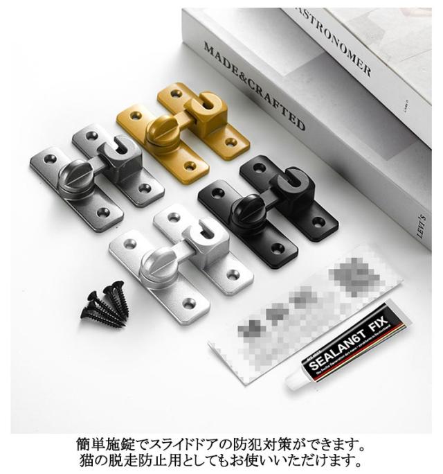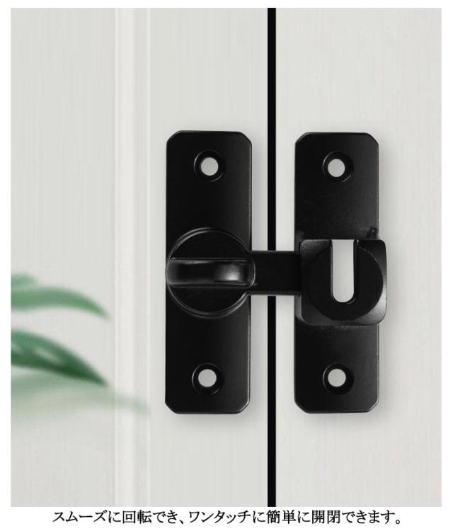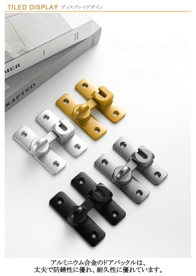 | 90度 180度 左右どちらでも使用可能 アルミニウム合金のドアバックルは、丈夫で防錆性に優れ、耐久性に優れています。 スムーズに回転でき、ワンタッチに簡単に開閉できます。 90度も180度も取り付けられるから、開き戸も引き戸も様々なドアに対応できます。 便利なフリップデザイン、プライバシーロック、フラップは、より快適な生活環境のためにさらなるセキュリティを提供します。 ネジまたは接着剤の2通りの取り付け方法あります。適切な位置にネジを取り付けるだけで完成し、使いやすい。 子供ケガ防止だけでなく、部屋の外に出ていかないようにしたり、様々な危険を防止できます。 簡単施錠でスライドドアの防犯対策ができます。猫の脱走防止用としてもお使いいただけます。 | |