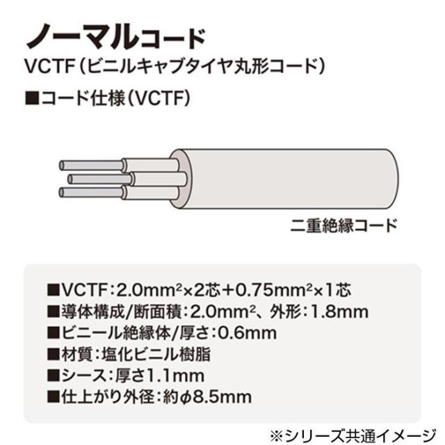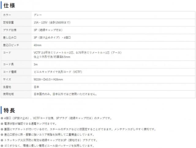 4個口(3P抜け止め)、VCTFコード仕様、3Pプラグ(絶縁キャップ付き)のタップです。電源状態が確認できる通電ランプ付きです。裏面にマグネットが付いているので、スチールのデスクなどに仮固定することができます。メンテナンスがしやすく便利です。差込口部分に熱・衝撃に強いユリア樹脂を採用して二重構造にしています。トラッキング火災予防に有効な絶縁キャップ付き3P(接地付き)プラグです。