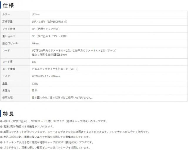 4個口(3P抜け止め)、VCTFコード仕様、3Pプラグ(絶縁キャップ付き)のタップです。電源状態が確認できる通電ランプ付きです。裏面にマグネットが付いているので、スチールのデスクなどに仮固定することができます。メンテナンスがしやすく便利です。差込口部分に熱・衝撃に強いユリア樹脂を採用して二重構造にしています。トラッキング火災予防に有効な絶縁キャップ付き3P(接地付き)プラグです。