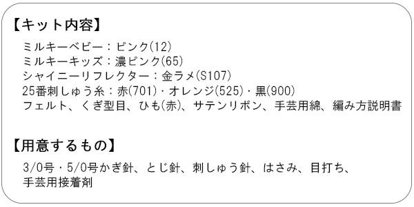 | 素材・材質 | ミルキーベビー:ウール60%・アクリル40% ミルキーキッズ:ウール60%・アクリル40% シャイニーリフレクター:キュプラ63%・ポリエステル37% 25番ししゅう糸:綿100% ひも:レーヨン100% 手芸綿:ポリエステル100% くぎ型目:ユリア樹脂100% リボン(両面):ポリエステル100% フェルト:ポリエステル100% |