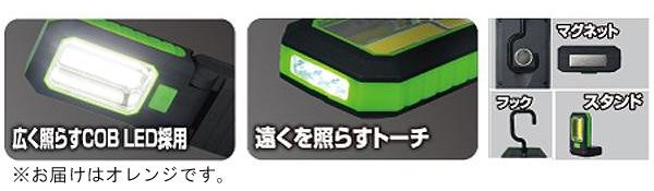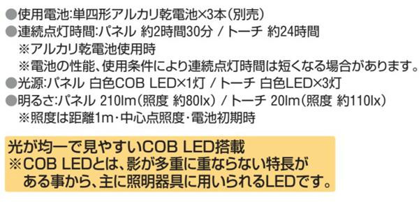 パネル部分には広く照らすことができるCOB LEDを搭載。遠くを照らす際にはトーチが便利!マグネット・フック・スタンドと用途に合わせた使い方が可能です。 |