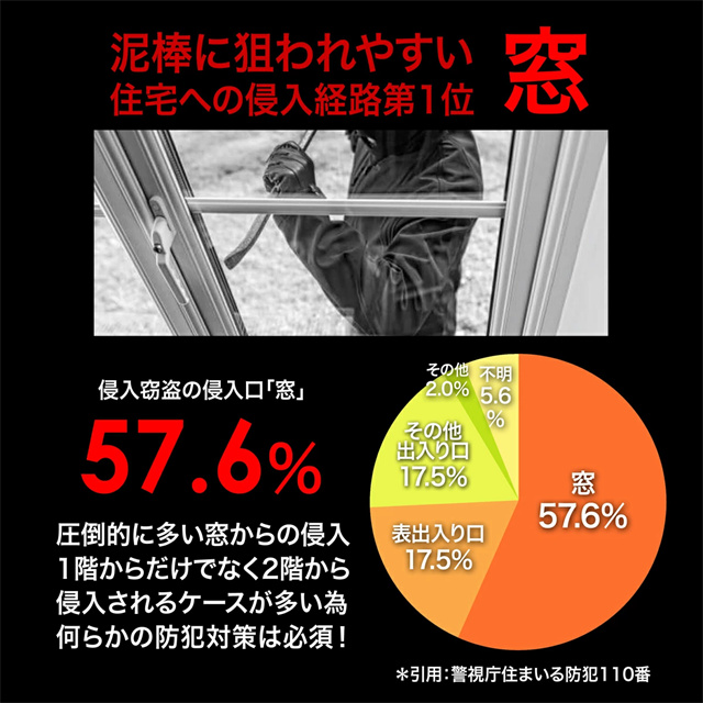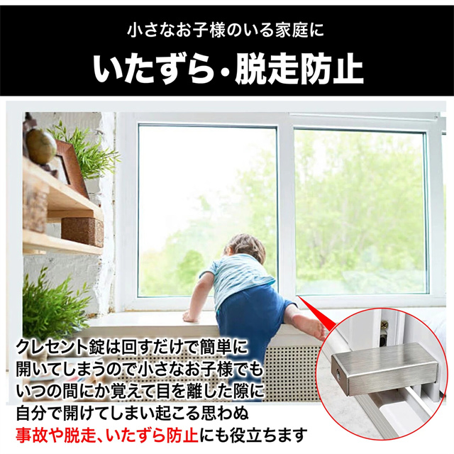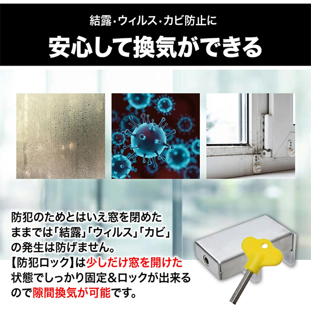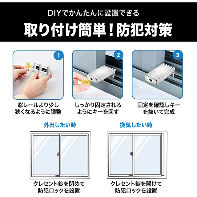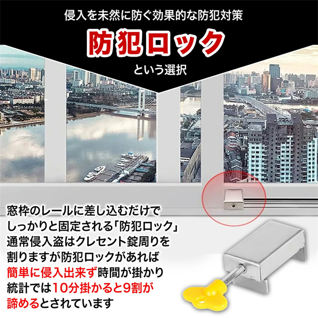 | 特徴 | 落下事故防止窓ロック 安心の別鍵タイプ 換気しながらでも窓のロックができる安全安心設計 \取り付け簡単!防犯対策/ DIYでかんたんに設置できる ・窓レールより少し狭くなるように調整 ・しっかり固定されるようにキーを回す ・固定を確認しキーを抜いて完成 \小さなお子様のいる家庭にいたずら・脱走防止/ クレセント錠は回すだけで簡単に開いてしまうので 小さなお子様でもいつも間にか覚えて目を離した隙に 自分で開けてしまい起こる思わぬ、事故や脱走、いたずら防止にも役に立ちます \安心して換気ができる/ 防犯のためとはいえ窓を閉めたままでは「結露」「ウィルス」「カビ」の発生は防げません。 【防犯ロック】は少しだけ窓を開けた状態でしっかり固定&ロックができるので隙間換気が可能です。 \侵入を未然に防ぐ効果的な防犯対策/ 窓枠のレールに差し込むだけで しっかりと固定される「防犯ロック」通常侵入盗はクレセント錠周りをわりますが 防犯ロックがあれば簡単に侵入できず 時間が掛かり統計では10分掛かると9割が諦めるとされています |