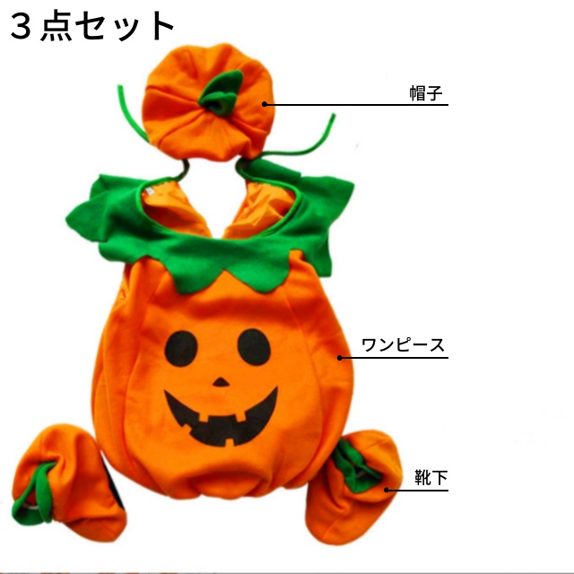 送料無料 冬新作 ハロウィン 衣装 子供 女の子 男の子 コスプレ かぼちゃ 仮装 3点セット オールインワン 帽子 靴カバー 赤ちゃん ベビー ハロウィン衣装 パーティー 演出服 可愛い
